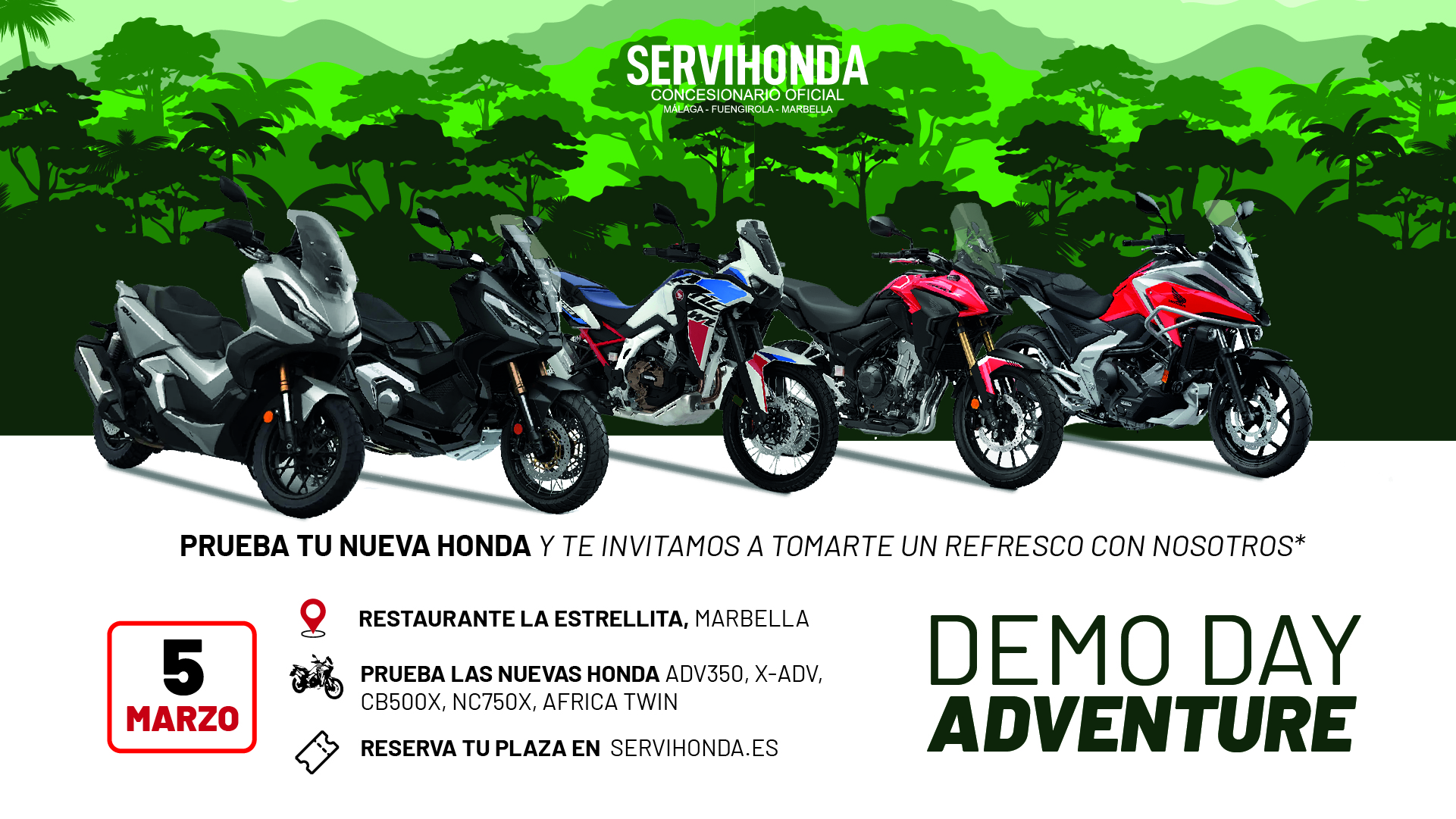 Next March 5th, we’ll be waiting for you at La Estrellita Restaurant, in Marbella, where you can see the new Honda ADV350, X-ADV, NC750X, CB500X, and Africa Twin, test them, and we’ll invite you to a drink with us!